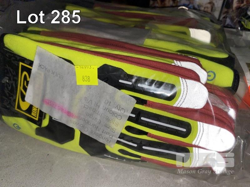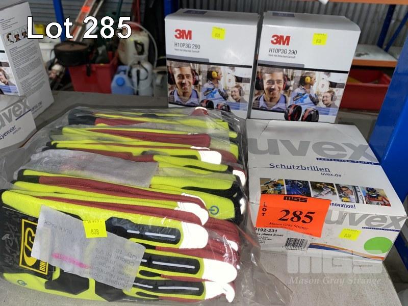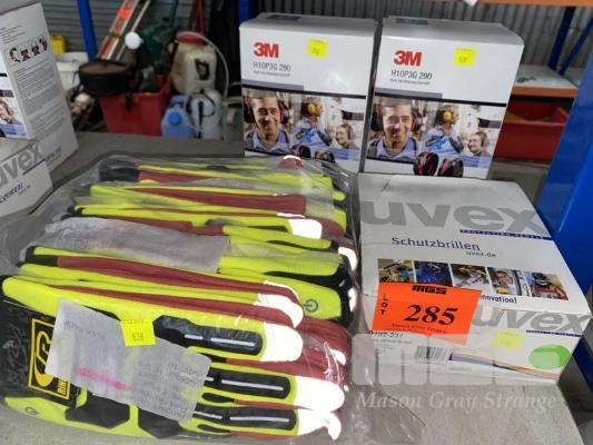 10 x PAIRS RIGGERS GLOVES, CR, R-14, SIZE LARGE, HI-VIS, ARMORED, 5 x PAIRS UVEX SAFETY GLASSES & 2 x PAIRS 3m PELTOR HARD HAT EAR MUFFS