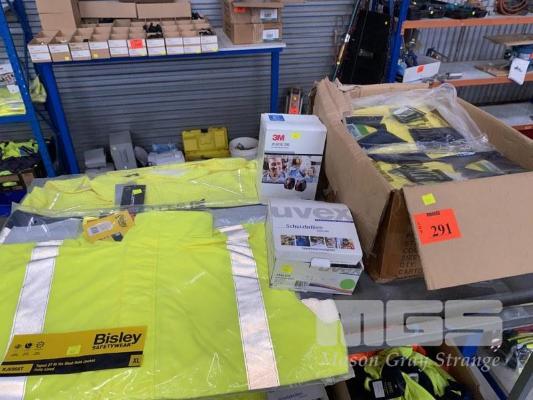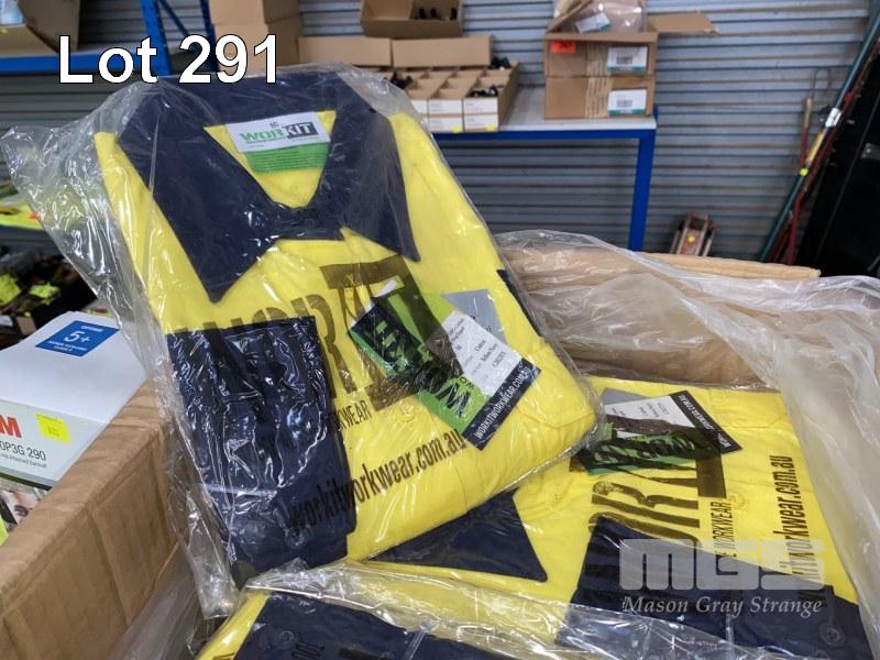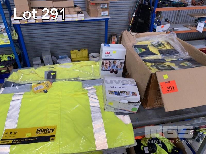 BISLEY & ELLIOTTS HI-VIS RAIN COATS, YELLOW, XL WITH 16 x WORKIT HI-VIS YELLOW/BLUE WORK SHIRTS, SIZE 16, 5 x PAIR UVEX SAFETY GLASSES & 3m PELTOR HARD HAT EAR MUFFS