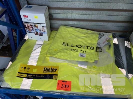1 x ELLIOTTS HI-VIS RAIN COAT, YELLOW, 2XL, 1 x BISLEY HI-VIS REFLECTIVE RAPED SHELL RAIN JACKET, BLUE/YELLOW, 2XL WITH PAIR 3M PELTOR HARD HAT ATTACHED EAR MUFFS