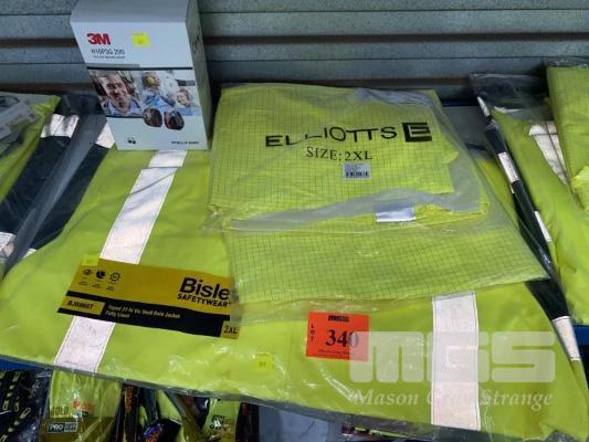 2 x ELLIOTTS HI-VIS RAIN COATS, YELLOW, 2XL, 1 x BISLEY HI-VIS REFLECTIVE RAPED SHELL RAIN JACKET, BLUE/YELLOW, 2XL WITH PAIR 3M PELTOR HARD HAT ATTACHED EAR MUFFS