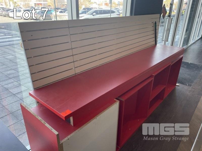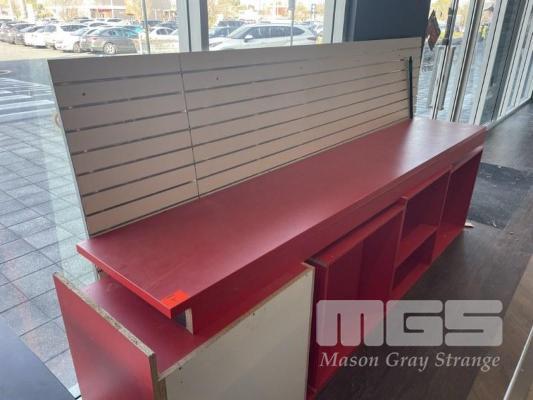 SHOP DISPLAY CABINETS COMPRISING SLATWALL, 290 x 150cm RED BENCH TOP, 290cm & 4 x RED CUBE BASE SECTIONS