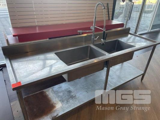 TWIN BOWL STAINLESS STEEL SINK UNIT, 240 x 70cm WITH SPLASHBACK & SHELF UNDER, COMPLETE WITH MIXER TAP/POT WASHER SPRAY