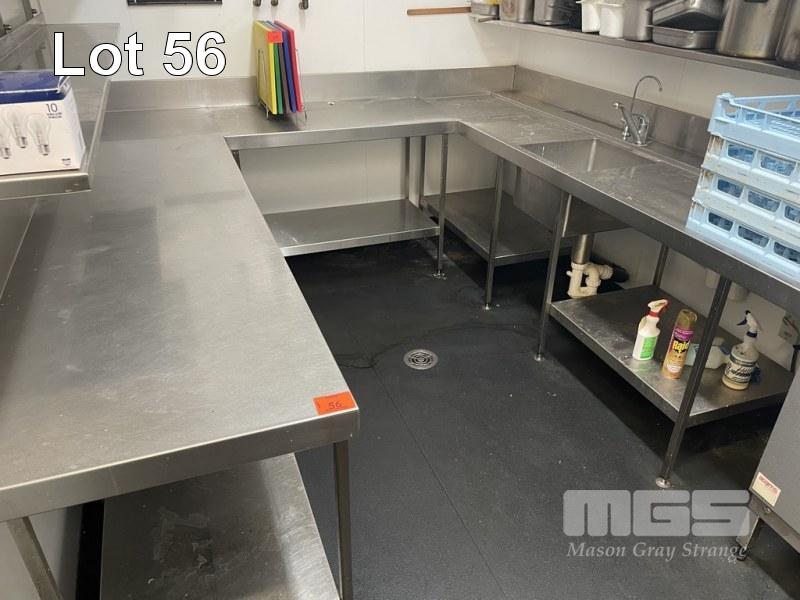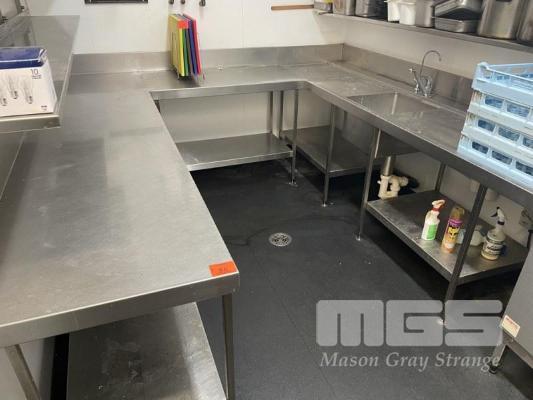 U-SHAPED SKULLERY BENCH, CUSTOM BUILT 2 TIER, SPLASHBACK & SINGLE BOWL SINK WITH TRAY SLIDE, 280-120-280cm "U" (70cm WIDE BENCH)
