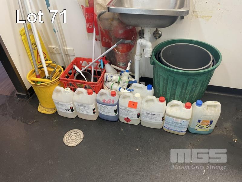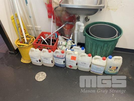 ASSORTED CLEANING DETERGENTS, MOP, BROOM, ETC
