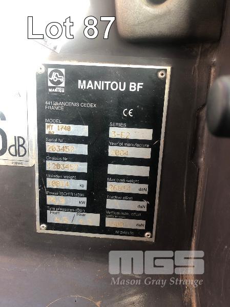 2004 MANITOU, MODEL: MT1740, SERIAL NO: 203457, CHASSIS NO: 1203457, UNLADEN WEIGHT: 10,814kg, 74.5kw, 4 TONNE CAP, 4x4, 4,727hrs, LAST SERVICE: 4,602hrs, AC CABIN, 4 CYLINDER PERKINS DIESEL: RG81374 FRONT STABILISER ARMS, HEADLIGHTS REGO: NVP346, WITH KEYS & REGO PAPERS NEXT MAJOR INSPECTION DUE 09/2023, NOTE: MINOR HUB LEAK FRONT LEFT WHEEL