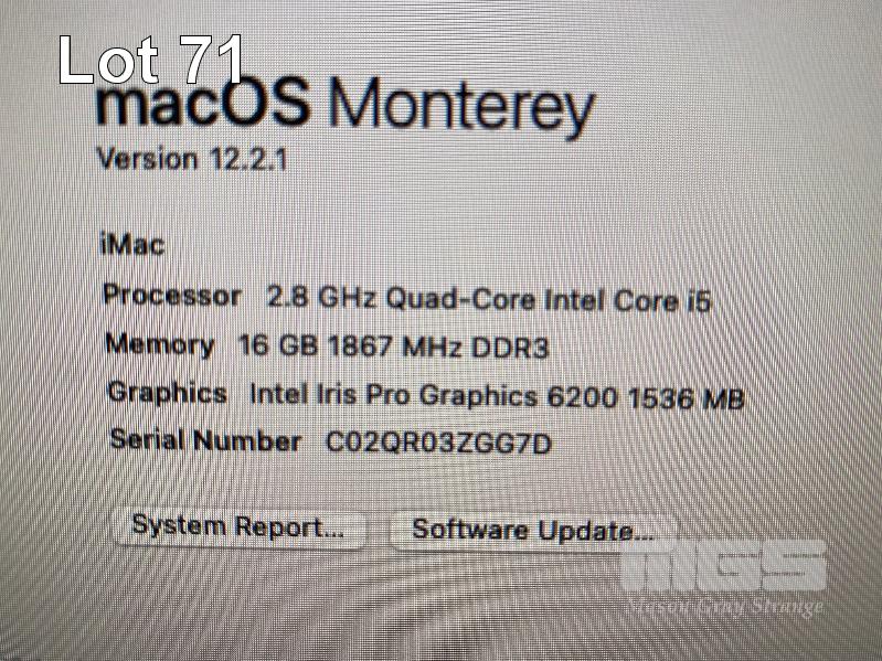 APPLE iMAC (A1418), CORE i5 5575R (5TH GEN) @ 2.8GHz, 16GB DDR3 RAM, 256GB SSD, BUILT-IN 21.5" DISPLAY (1920x1080), INTEL IRIS PRO GRAPHICS 6200, Wi-Fi, MAC OS 12 INSTALLED (NO KEYBOARD, NO MOUSE, NO CABLE) S/N:C02QR03ZGG7D