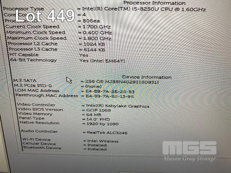 LAPTOP, DELL LATITUDE 7490, CORE i5 8250U (8TH GEN) @ 1.6GHz, 16GB DDR4 RAM, 256GB M.2 SSD, 14" WIDESCREEN (1920x1080), INTEL KABYLAKE GRAPHICS, CELLULAR, Wi-Fi, BLUETOOTH, WINDOWS 11 PRO INSTALLED & POWER SUPPLY (NOTE: NO BATTERY, MARKS ON SCREEN) S/N:BQN8LQ2