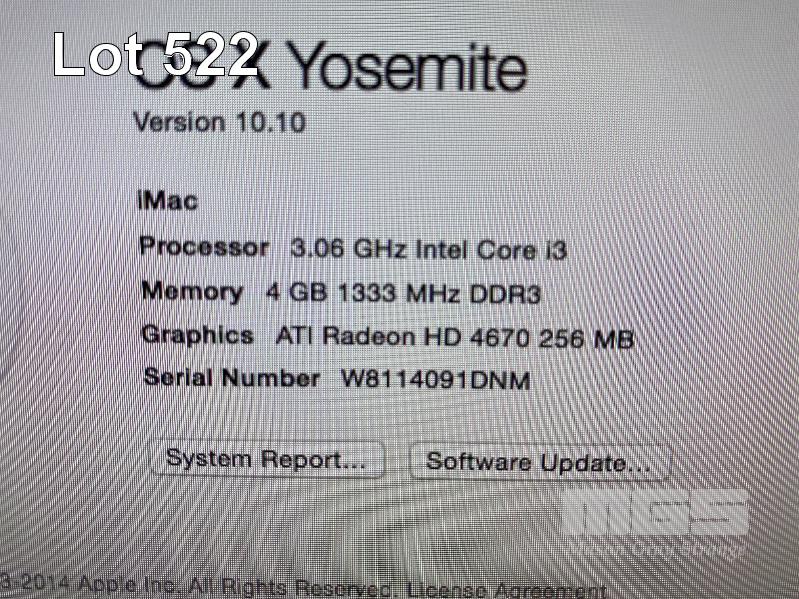 APPLE iMAC (A1311), CORE i3 540 @ 3.06GHz, 4GB DDR3 RAM, 500GB SATA HDD, DVD-RW, BUILT-IN 21.5" DISPLAY (1920x1080), Wi-Fi, MAC OS 10.10 INSTALLED (NO KEYBOARD, NO MOUSE, NO CABLE) S/N:W8114091DNM