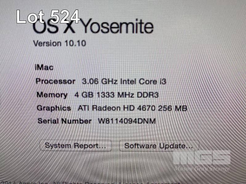 APPLE iMAC (A1311), CORE i3 540 @ 3.06GHz, 4GB DDR3 RAM, 500GB SATA HDD, DVD-RW, BUILT-IN 21.5" DISPLAY (1920x1080), Wi-Fi, MAC OS 10.10 INSTALLED (NO KEYBOARD, NO MOUSE, NO CABLE) (NOTE: SMALL CHIP ON CORNER OF SCREEN) S/N:W8114094DNM