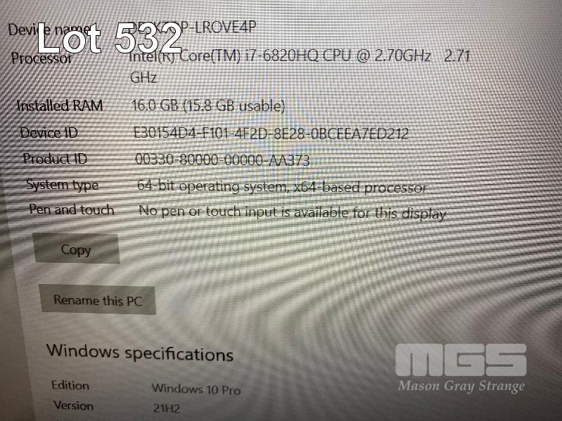 LAPTOP, LENOVO THINKPAD P50 MOBILE WORKSTATION, TYPE 20EQ, CORE i7 6820HQ (6TH GEN) @ 2.7GHz, 16GB DDR4 RAM, 256GB SSD, 15.6" WIDESCREEN (1920x1080), 4GB NVIDIA QUADRO M2000M VIDEO, Wi-Fi, BLUETOOTH, WINDOWS 10 PRO INSTALLED & POWER SUPPLY (NOTE: MESSAGE ON STARTUP "FAN ERROR", MARKS ON SCREEN) S/N:PC0CZS9J