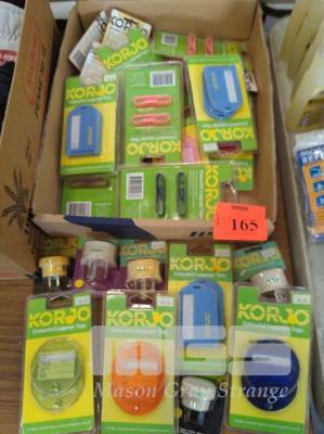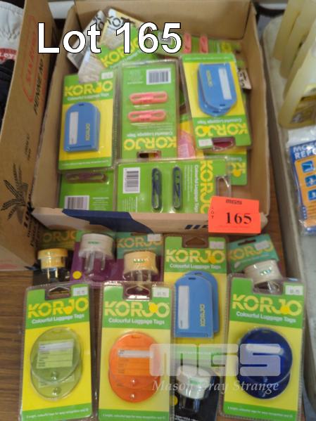 ASSORTED KORJO MULTICOLOURED LUGGAGE TAGS AND TRAVEL ADAPTORS. 20 ITEMS APPROX.