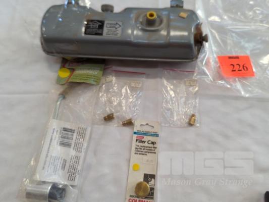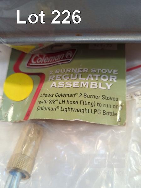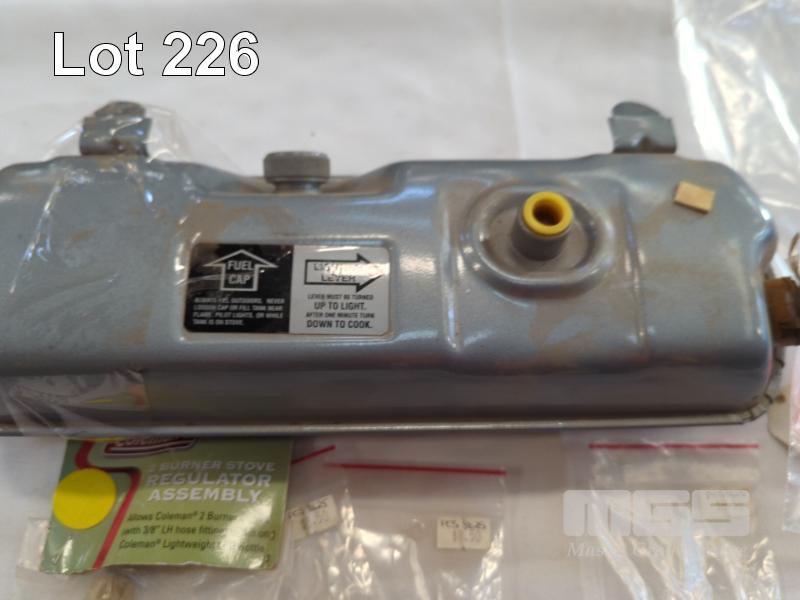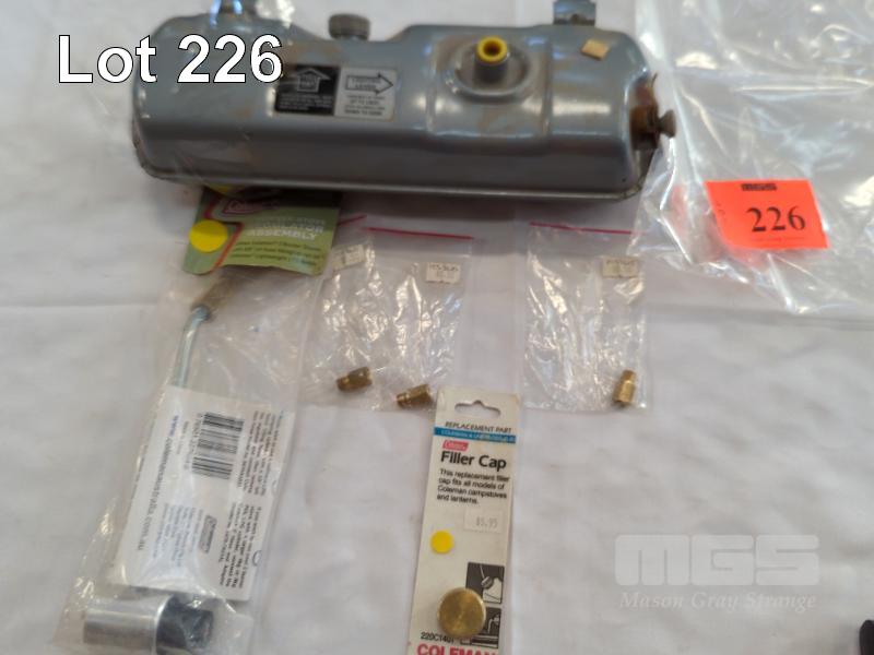 VARIOUS LANTERN/STOVE REPLACEMENT PARTS. INCLUDES FILL A CAP, 2- BURNER STOVE REGULATOR ASSEMBLY, FUEL TANK AND 3 X UNIDENTIFIED NIPPLES.