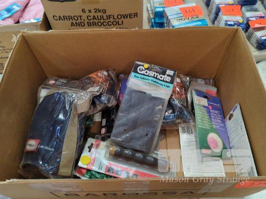ASSORTED GAS MATTE ACCESSORIES. INCLUDES REGULATOR BRACKETS, GAS MANTELS, LANTERN PROTECTION BAGS ETC. 1 X BOX