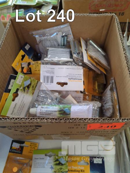 QUANTITY OF REPAIR KITS, PARTS AND ACCESSORIES. INCLUDES OZTRAIL TENT DOCTOR EMERGENCY KITS & DOME TENT POLE RETHREADING KITS, TENT SEAM SEALER, TENT EYELET TOOL & EYELET SETS, ROPE SPLICE CLIPS, SPRING BUTTON CLIPS ETC. 1 X BOX, 30 ITEMS APPROX.