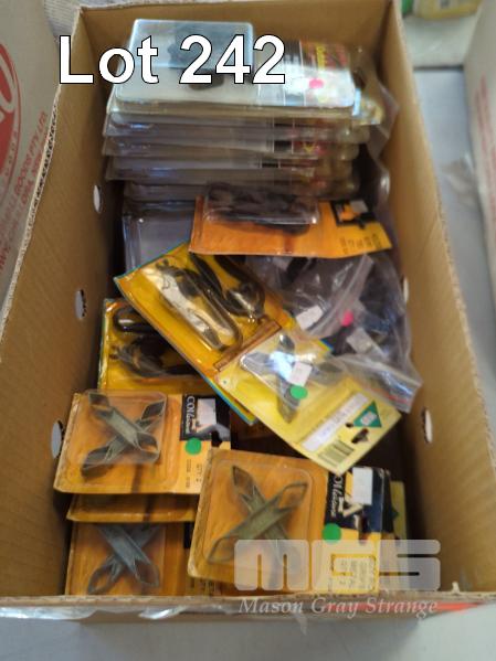 QUANTITY OF TENT GUY ROPE ACCESSORIES IN PACKS, ASSORTED TYPES & SIZES. INCLUDES GUY ROPE METAL GRIPS, HOLESS ROPE TIES, ROPE RUNNER V CLAMPS, GUY ROPE GRIPS ETC. 1 X BOX, 35 PACKS APPROX.