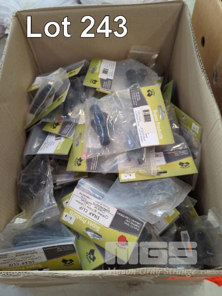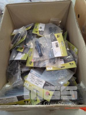 QUANTITY OF PLASTIC TENT POLE PRODUCTS, ASSORTED SIZES. INCLUDES PACKS OF SNAP CLIPS, BOW ENDS, END CAPS, SHOCK CORD HOOKS, BIRDS BEAK & PLATE SETS ETC. 1 X BOX, 70 PACKS APPROX.