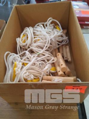 NYLON GUY ROPES WITH TENSIONERS AND QUANTITY OF WOODEN TENSIONERS. ALL LOOSE. 1 X BOX.
