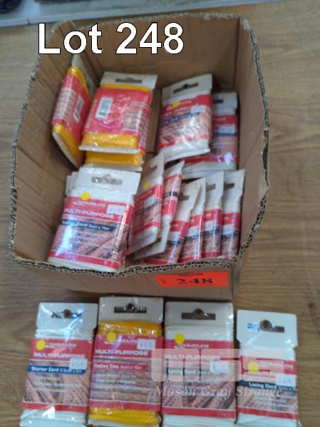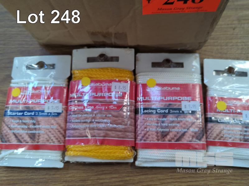 20 X PACKS OF KOOKABURRA MULTI-PURPOSE CORD. 5 @ PACKS CLOTHES LINE CORD, 4 MM X 10 M. 3 @ PACKS STARTER CORD, 3.5 MM X 5 M. 5 @ PACKS LACING CORD, 3 MM X 15 M. 7 @ PACKS LACING CORD, 2 MM X 15 M.