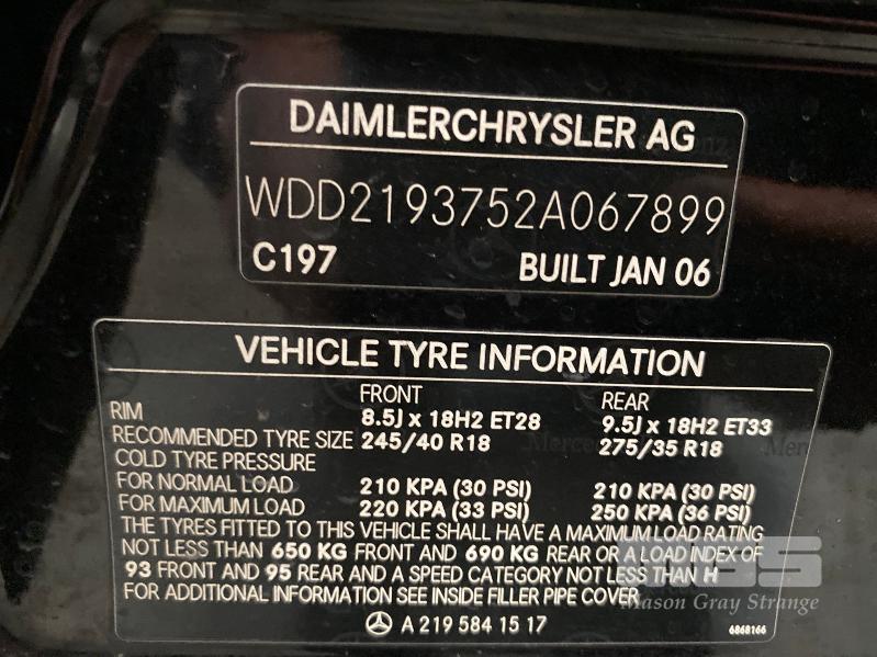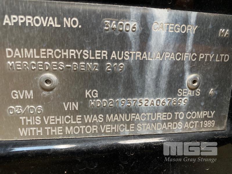 2006 MERCEDES BENZ 219 CLS SEDAN REG: XA 738U (SA) VIN: WDD2193752A067899 ENG: 11396730734526 ODO: 192,147kms SHOWING V8 PETROL, 4 SPEED AUTOMATIC TRANSMISSION, BLACK DUCO, 4 DOORS, 4 SEAT, ABS, AIR BAG, AIR CON, ALLOY WHEELS, BLUETOOTH, CD PLAYER, CENTRAL LOCKING, CRUISE CONTROL, IMMOBILISER, LEATHER TRIM, POWER STEERING, POWER WINDOWS, SAT NAV, SPARE WHEEL, SUNROOF, TRACTION CONTROL, KEY #6 (WITH 1 KEY/S, WITH OWNER'S MANUAL, WITH SERVICE BOOKS)