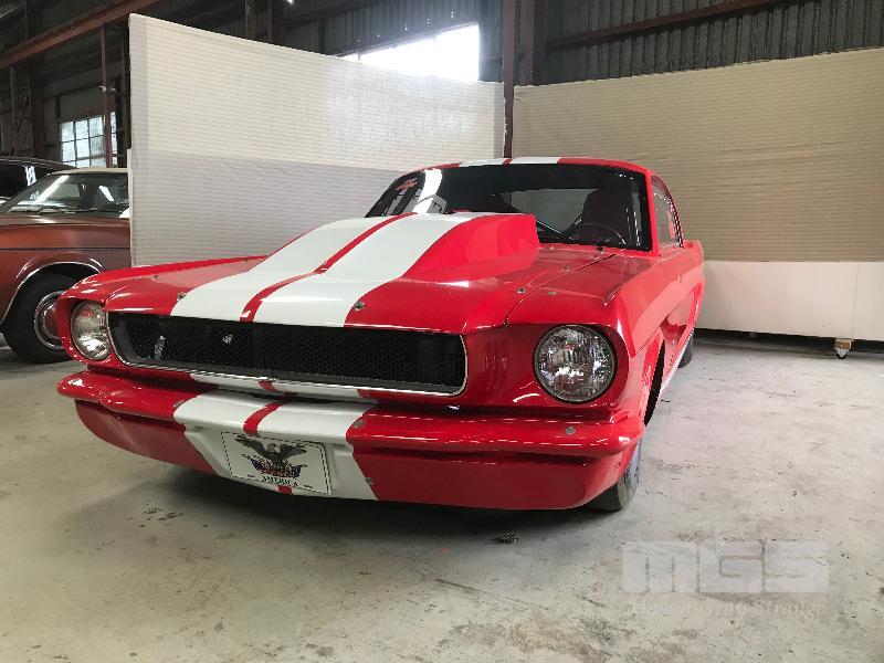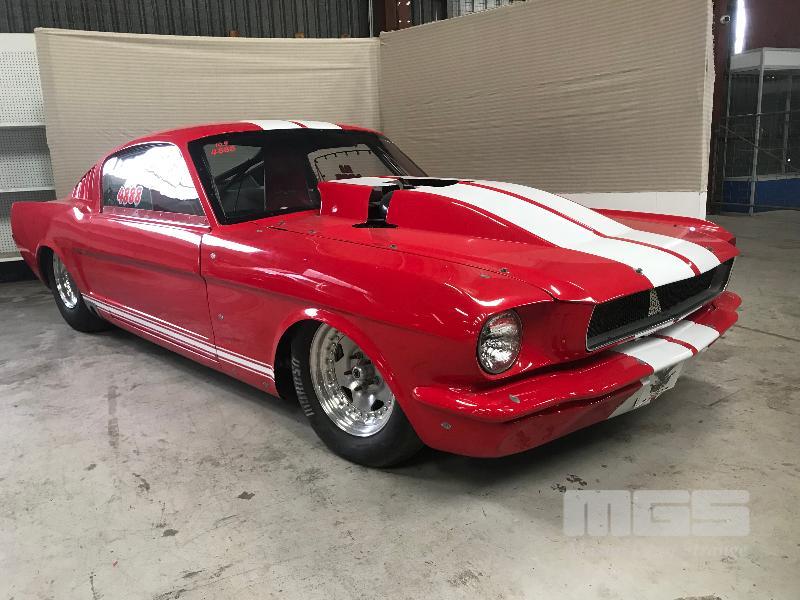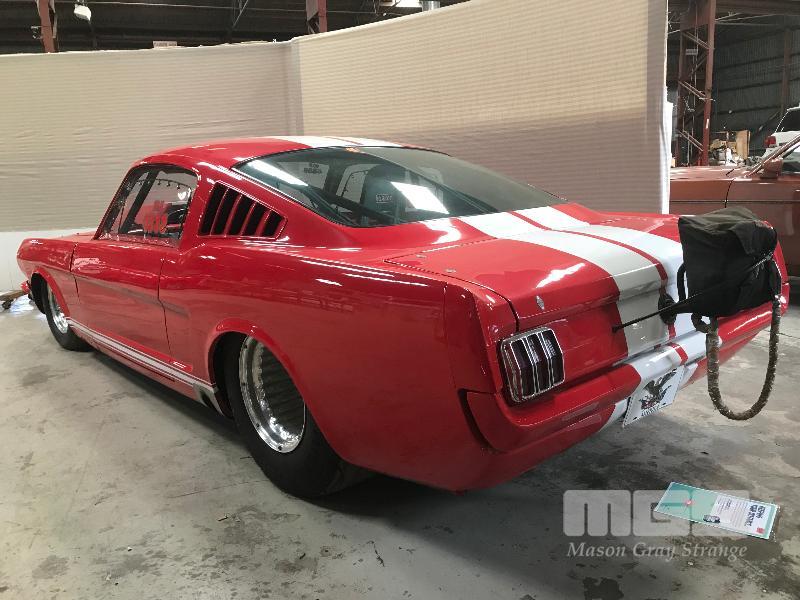 1965 FORD MUSTANG (LHD) FASTBACK COUPE DRAG RACING CAR FORD 355 CUI V8, 2 SPEED POWERGLIDE, PETROL, RED DUCO, 1 DOORS, 2 SEAT, FULL TUBE CHASSIS BUILT BY CHRIS ALSTON CHASSISWORKS USA TIN ROOF & GAURDS, FIBREGLASS PANELS EXTENSIVELY REBUILT SINCE ARRIVAL IN AUSTRALIA DART BLOCK, AFR HEADS, JE PISTONS, EAGLE ROTATING ASSEMBLY, JESSEL ROCKERS FITTED WITH J7 VORTEC SUPER CHARGER PLUS NEW 2000CC INJECTORS UPGRADED FUEL SYSTEM FITTED WITH TRANS BRAKE & 5000 RPM STALL CONVERTER FORD 8.8 MODIFIED DIFF BY MARK WILLIAMS WILLWOOD DISC BRAKES, CONVO PRO ALLOY WHEELS RAN A 8 SECOND QTR MILE BEFORE REBUILD (ALL INFORMATION PROVIDED BY VENDOR) (NO PAPERS, NO OWNER'S MANUAL, NO SERVICE BOOKS)