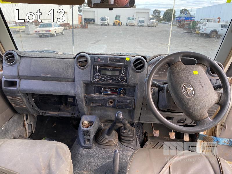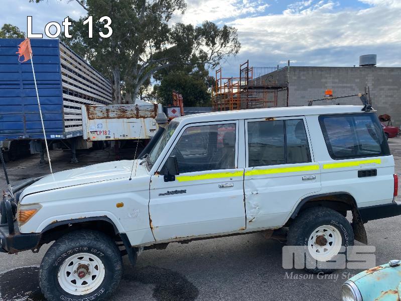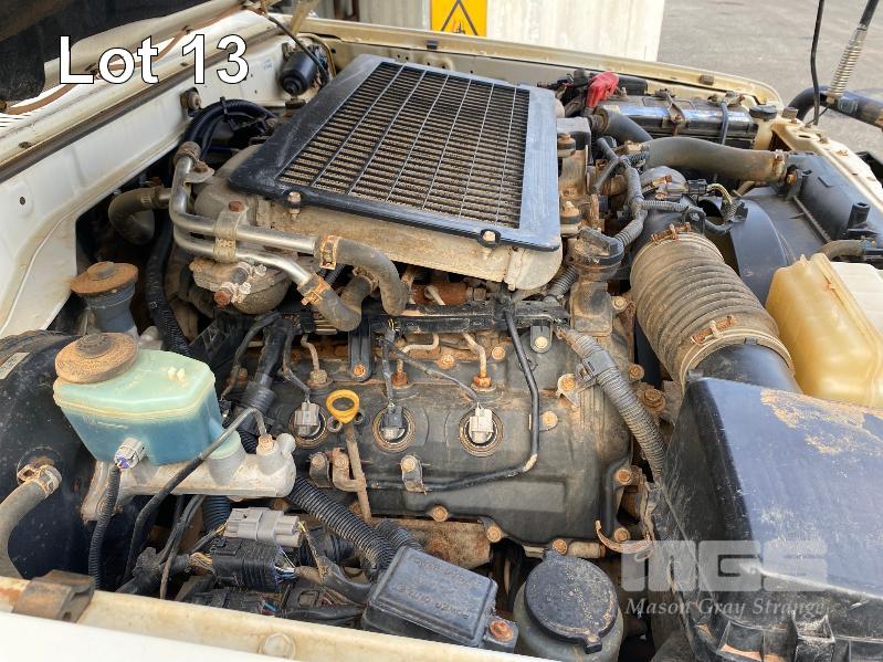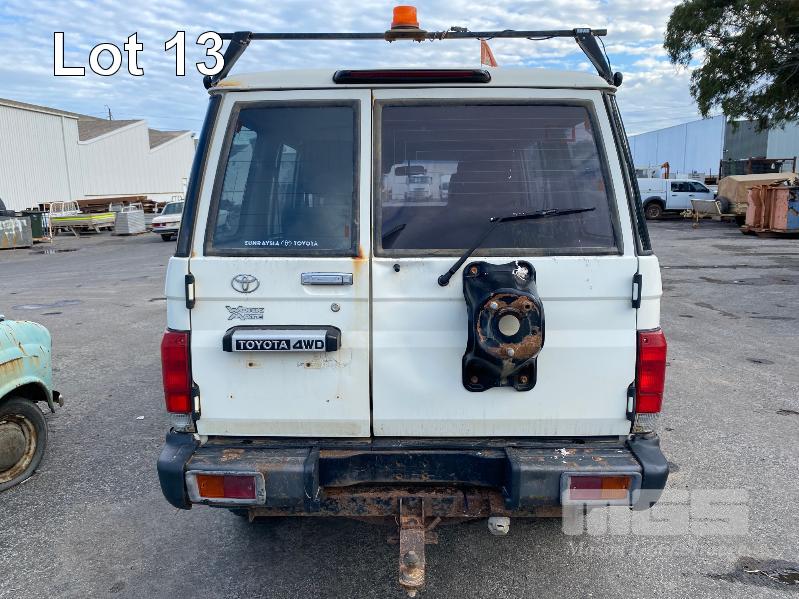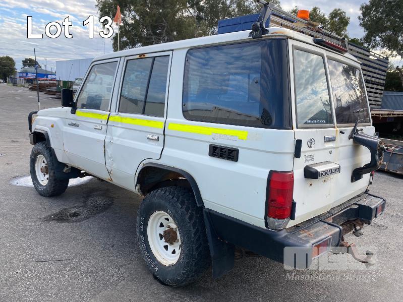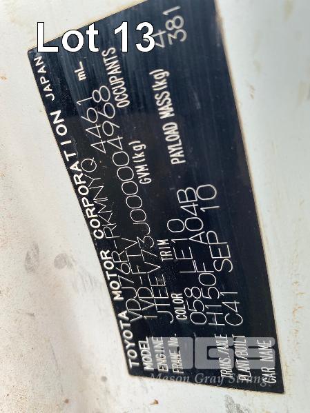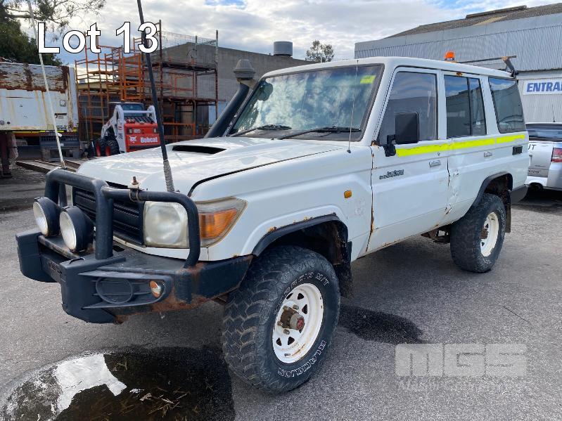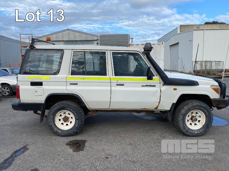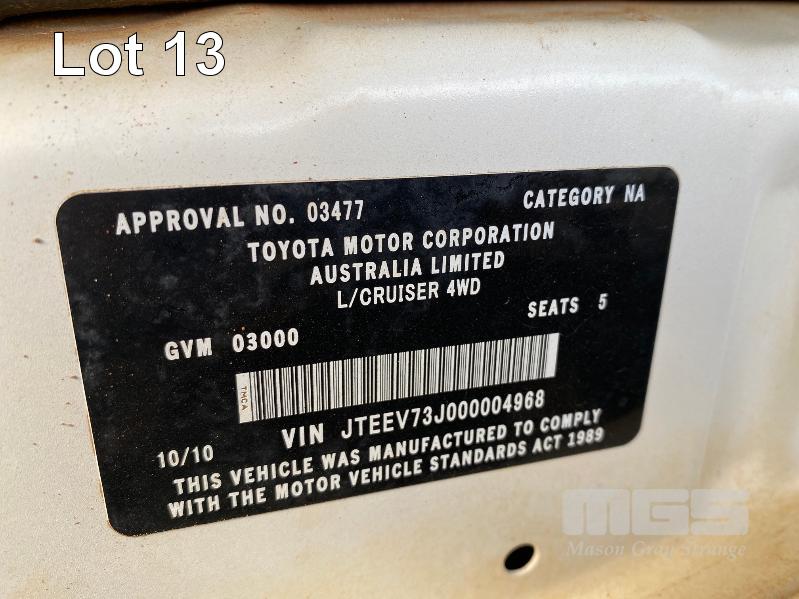 2010 TOYOTA LANDCRUISER WAGON 4WD REG: NO PLATES VIN: JTEEV73J00004968 ODO: 321,453 kms INDICATED V8, 5 SPEED MANUAL, WHITE DUCO, 5 DOORS, 5 SEAT, 4WD AIR BAG, BULL BAR, CD PLAYER, FOG LAMPS, POWER STEERING, SPOT LIGHTS, TOW BAR, EX MINE VEHICLE (NO PAPERS, WITH 2 KEY/S, NO OWNER'S MANUAL, NO SERVICE BOOKS) CONDITION: LEFT SIDE - DENTS, SCRATCHES, RUST