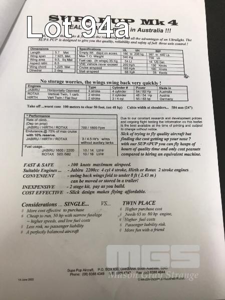 SUPERPUP MARK IIII KIT AIRCRAFT SOUTH AUSTRALIAN DESIGNED/BASED COMPANY PARTLY COMPLETED PROJECT (ABONDONED DUE TO POOR HEALTH) ALL COMPONENTS ARE INCLUDED IN THE PACKAGE FUSELAGE HAS BEEN PROFESSIONALLY WELDED MORE CONSTRUCTION NEEDED THAN PREVIOUS AIRCRAFT SOLD DIAMENSIONS LENGTH - 5.7 MTRS WING SPAN - 7.9 MTRS WING AREA - 9.5 SQ MTRS ASPECT RATIO - 6.5 WING CHORD 1.225 MTRS DIHEDRAL - 2 DEG EMPTY WEIGHT - 200 KGS MAX T.O WEIGHT - 340 KGS FUEL CAPACITY - 54 LTR CRUISE AIRSPEED - 185 KM/H STALL AIRSPEED - 66 KM/H SWING BACK WINGS, FOLD UNDER 2.43 MTRS AND CAN BE MOVED AND STORED IN TRAILER. FABRICATED FUSELAGE STANDS INCLUDED & ASSORTED JIGS FOR COMPONENTS FUSELAGE COST TO DATE 26-28K (NO PAPERS, NO OWNER'S MANUAL, NO SERVICE BOOKS)