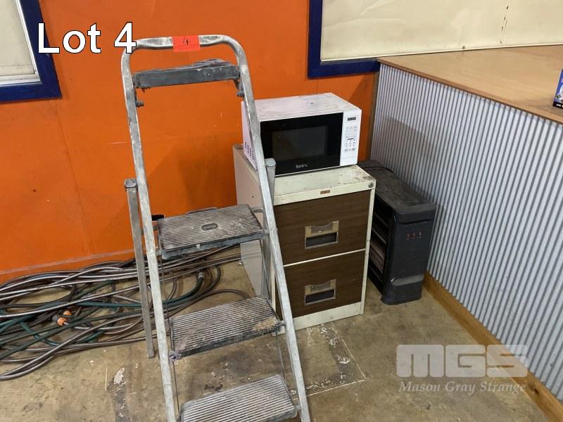 3 FOOT STEP LADDER, FILING CABINET, MICROWAVE, ELECTRIC BAR HEATER
