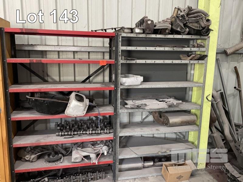 2 x STEEL RACK PLUS ASSORTED ENGINE PARTS, MUFFLERS ETC.