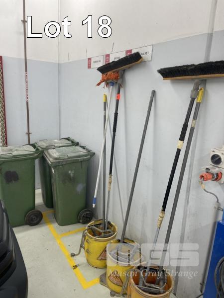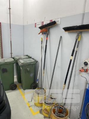 3 x WASTE BINS, MOPS, BUCKETS BROOMS ETC.