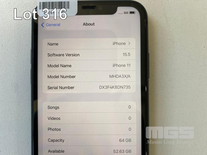 APPLE iPHONE 11, 64GB, BLACK, MODEL MHDA3X/A (NO CHARGER, NO CABLE) S/N:DX3F4K8DN735