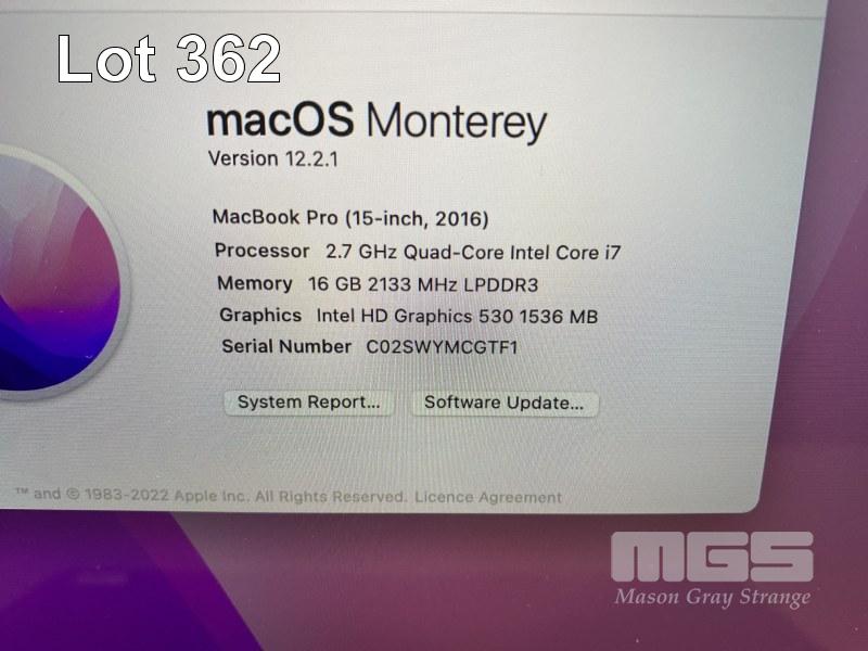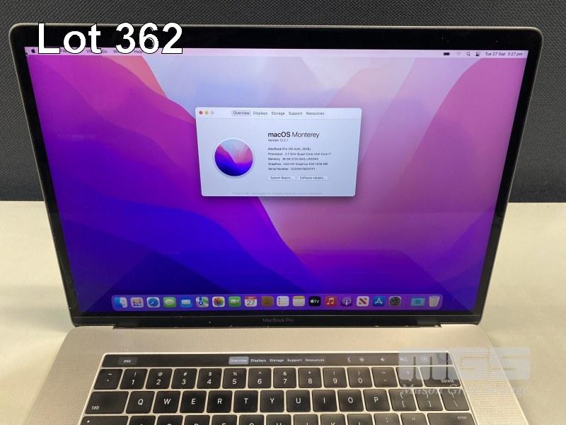 LAPTOP, APPLE MACBOOK PRO (A1707), CORE i7 6820HQ (6TH GEN) @ 2.7GHz, 16GB DDR3 RAM, 1TB SSD, 15.4" RETINA DISPLAY (2880x1800), INTEL HD GRAPHICS 530, THUNDERBOLT 3, TOUCHBAR, Wi-Fi, MAC OS 12 INSTALLED (NO USB-C POWER SUPPLY) (NOTE: MINOR MARKS ON SCREEN) S/N:C02SWYMCGTF1