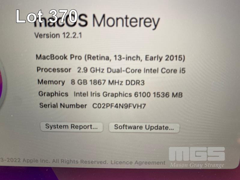 LAPTOP, APPLE MACBOOK PRO (A1502), CORE i5 5287U (5TH GEN) @ 2.9GHz, 8GB DDR3 RAM, 512GB SSD, 13.3" RETINA DISPLAY (2560x1600), INTEL IRIS GRAPHICS 6100, Wi-Fi, MAC OS 12 INSTALLED & POWER SUPPLY S/N:C02PF4N9FVH7