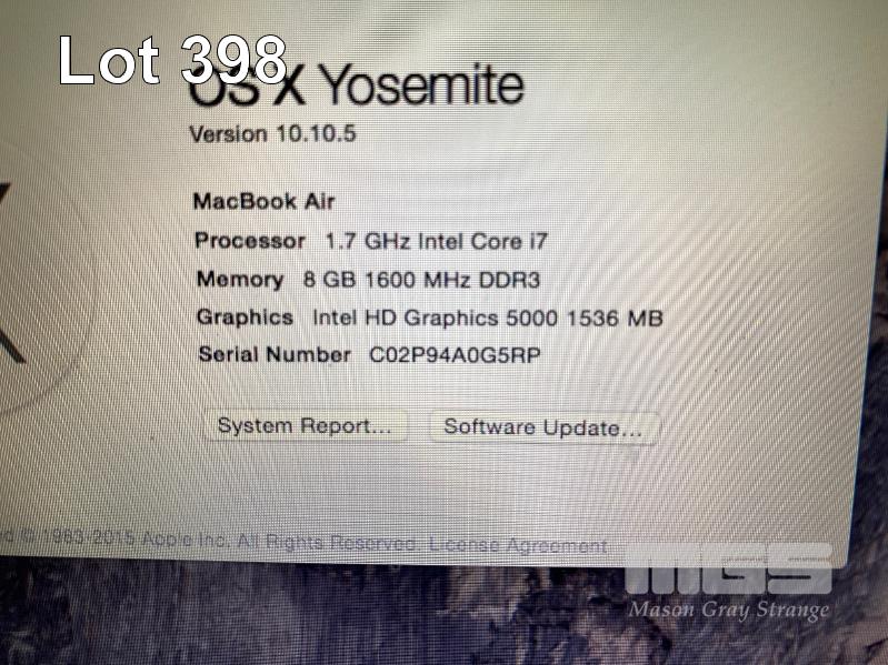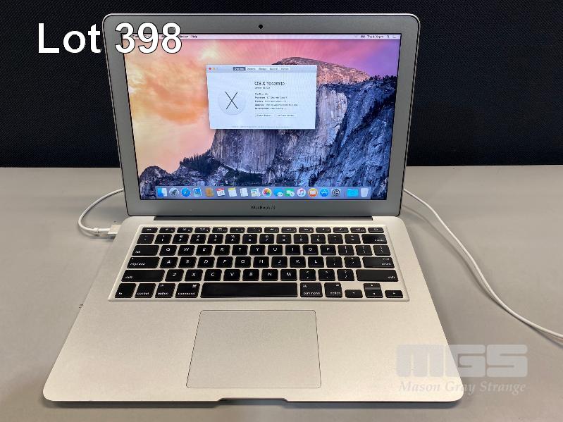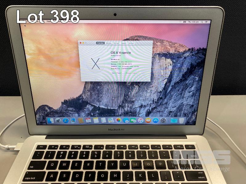 LAPTOP, APPLE MACBOOK AIR (A1466), CORE i7 4650U (4TH GEN) @ 1.7GHz, 8GB DDR3 RAM, 512GB SSD, 13.3" WIDESCREEN (1440x900), INTEL HD GRAPHICS 5000, Wi-Fi, MAC OS 10.10 INSTALLED & POWER SUPPLY (NOTE: BATTERY NOT CHARGING) S/N:C02P94A0G5RP
