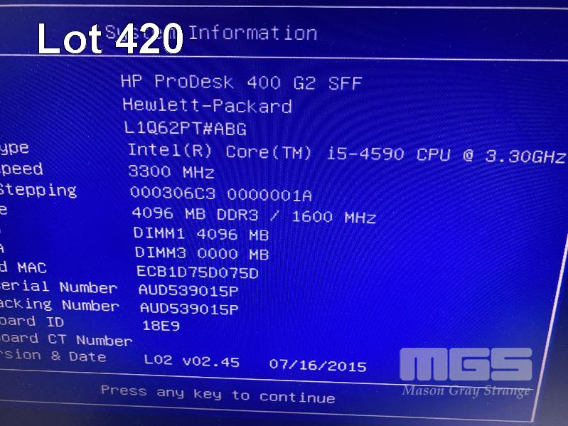 DESKTOP PC, HP PRODESK 400 G2 SFF, CORE i5 4590 (4TH GEN) @ 3.3GHz, 4GB DDR3 RAM, 120GB SSD, DVD-RW, INTEL HD VIDEO, WINDOWS 10 PRO INSTALLED (NO KEYBOARD, NO MOUSE) S/N:AUD539015P