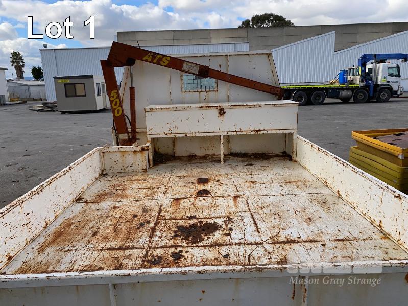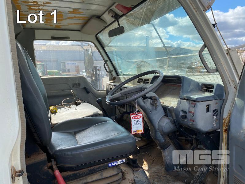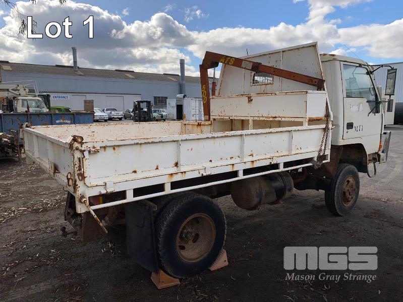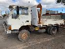 1989 MITSUBISHI CANTER 4x4 TIPPER REG: VRY 330 (SA) ODO: 215,603kms SHOWING 4 CYLINDER DIESEL, 5 SPEED MANUAL TRANSMISSION, SPRING SUSPENSION, WHITE DUCO, 2 DOORS, 3 SEAT, BULL BAR, ROCK SCREEN, VISOR, STEEL TIPPER BODY WITH HINGED SIDES & REAR, TOW BALL FITTED WITH HIAB CRANE BEIND CAB 500kg ATS TOOLBOX SPARE WHEEL KEY #32 (WITH 1 KEY/S) CONDITION: BRAKES - ALL FAULTS - NO COMPLIANCE OR MANUFACTURING PLATES