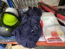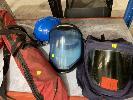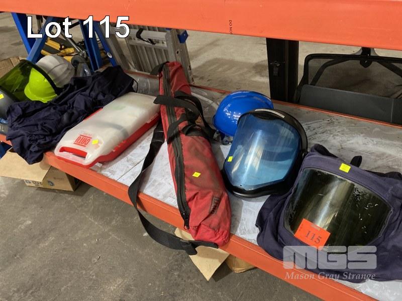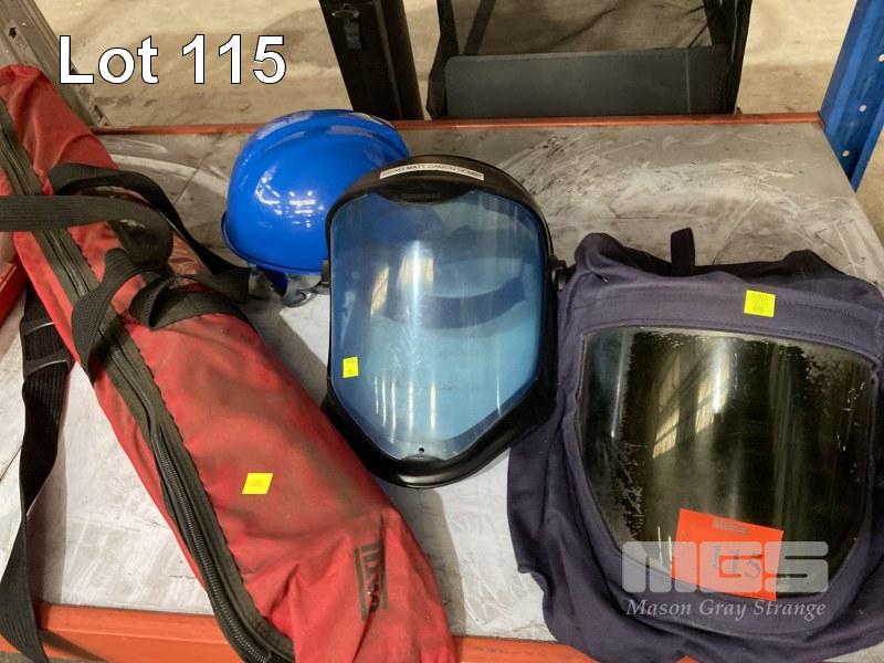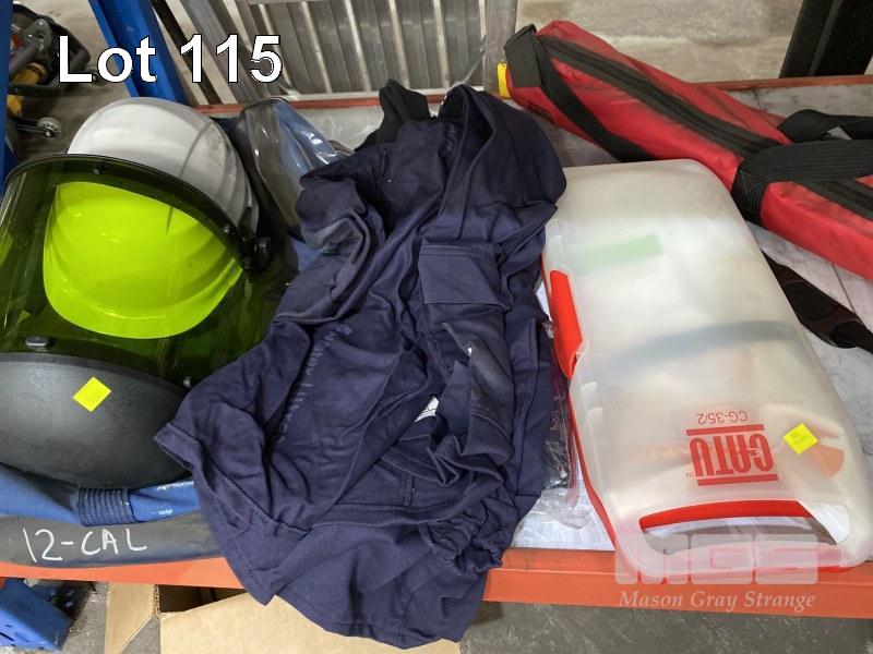 HIGH VOLTAGE PROTECTIVE EQUIPMENT INC CATU RUBBER SAFETY MAT IN CARRY BAG, ARC FLASH PROTECTIVE HOOK & FACE SHIELD WITH 12 CAL PROTECTIVE TOP, GLOVES, 2 x FACE SHIELDS & HARD HATS
