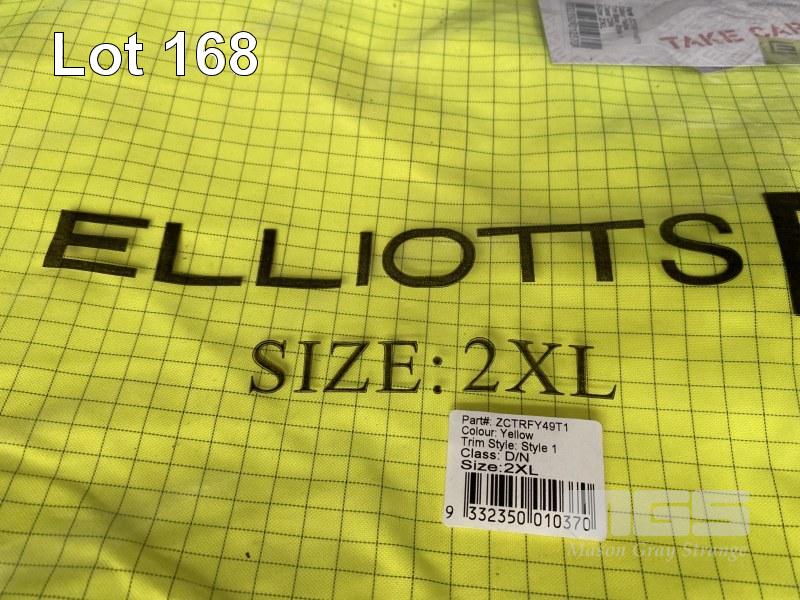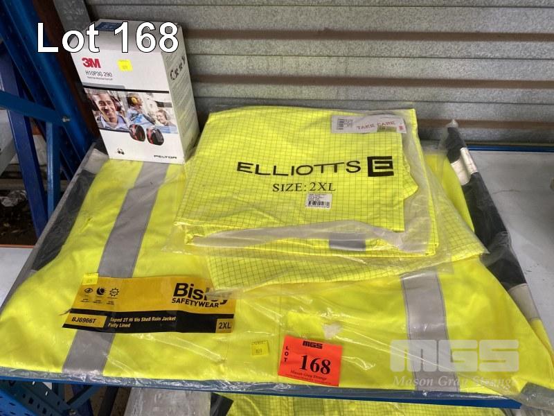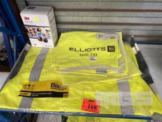 2 x ELLIOTTS HI-VIS RAIN COATS, YELLOW, 2XL, 1 x BISLEY HI-VIS REFLECTIVE RAPED SHELL RAIN JACKET, BLUE/YELLOW, 2XL WITH PAIR 3M PELTOR HARD HAT ATTACHED EAR MUFFS