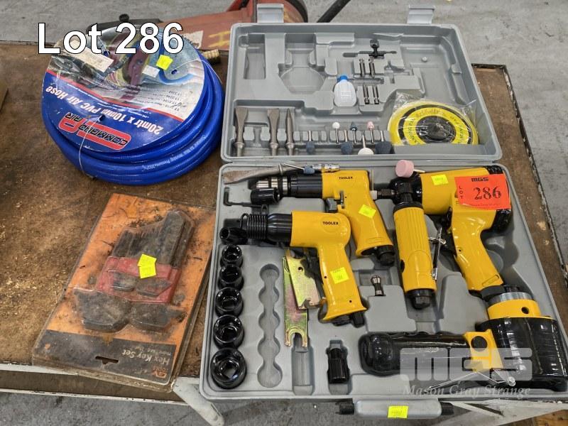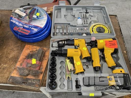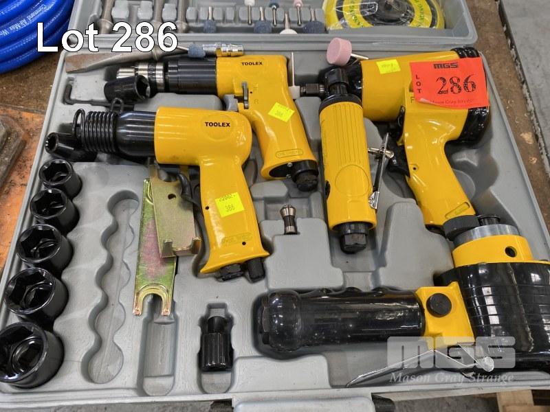 PNEUMATIC TOOL SET INCLUDING TOOLEX IMPACT DRIVER, DRILL, POLISHER, DIE GRINDER & CHISEL IN CARRY CASE WITH ALL ATTACHMENTS, BITS, AIR HOSE & ALLEN KEY SET