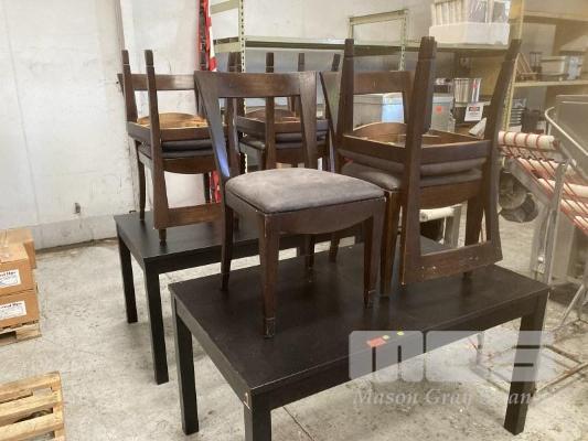 2 X EXTENSION TABLES, 140 X 85CM, DARK STAIN & 7 CHAIRS