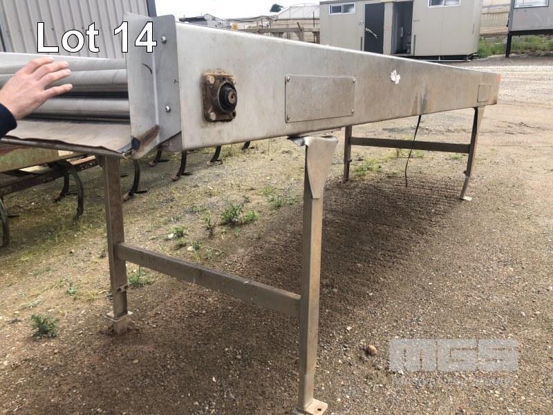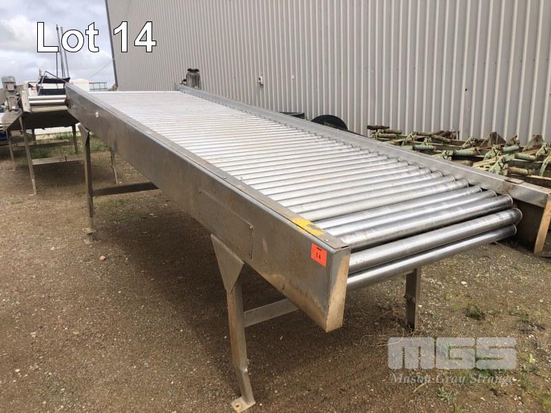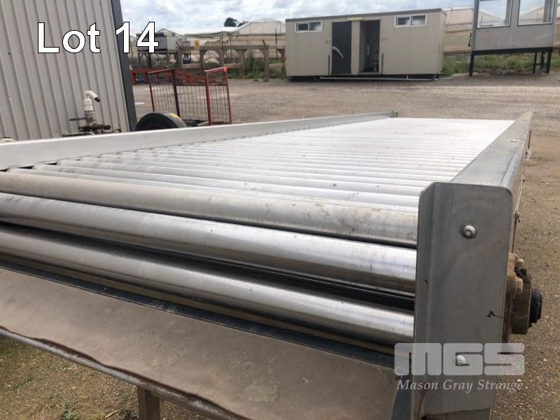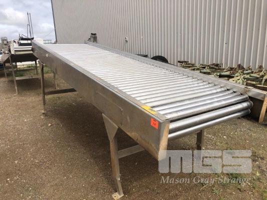 POWERED ROLLER CONVEYOR SECTION, ON LEGS, 4200 x 1250mm, ELECTRIC MOTOR, NON MAGNETIC STAINLESS STEEL CONSTRUCTION