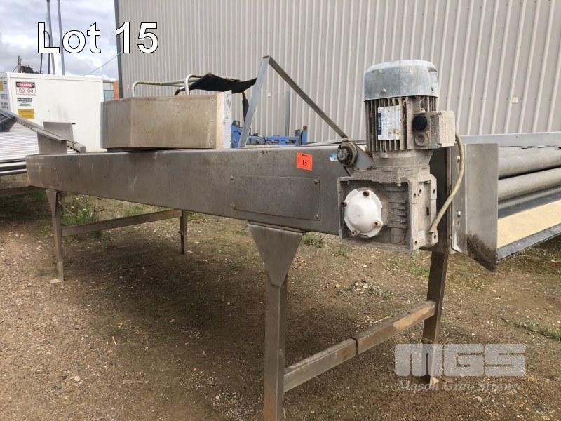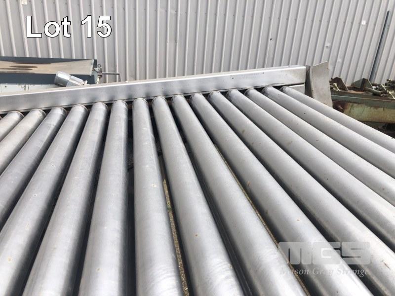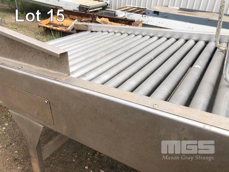 POWERED ROLLER CONVEYOR SECTION, ON LEGS, 4200 x 1250mm, ELECTRIC MOTOR, NON MAGNETIC STAINLESS STEEL CONSTRUCTION