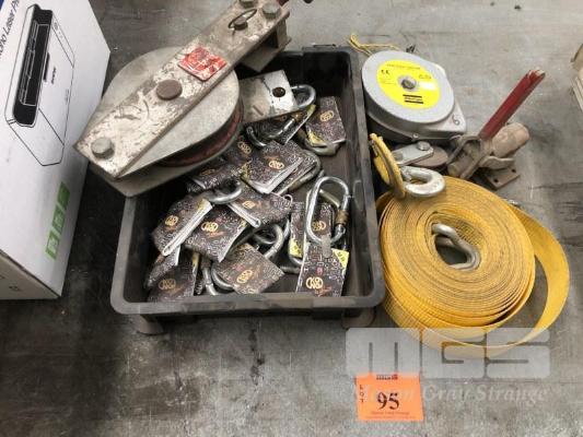TUB OF QUICK RELEASE LATCHES, ATLAS COPCO SUSPENSION RETURN CABLE, MODEL: RIL-5, 6 INCH SNATCH BLOCK ANCHOR & STRAP