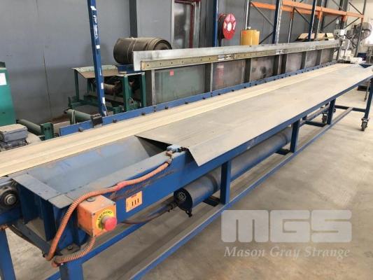 CONVEYOR BELT ON MOBILE STAND, 5.7m, 200mm BELT, WITH 23 x PNEUMATIC AIR JETS, 415v DRIVE WITH OVERHEAD LIGHTING & ES