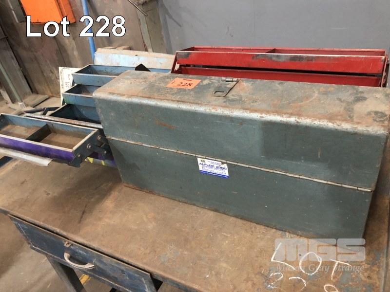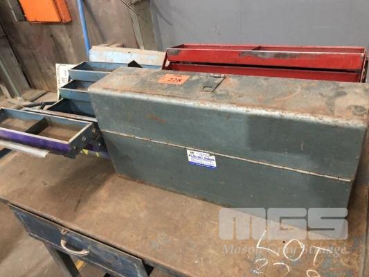 SMALL STEEL WORK BENCH SINGLE DRAWER, 1200 x 670 x 900mm PLUS 2 x CANTILEVER TOOL BOXES WITH 3 TIER STOCK TROLLEY
