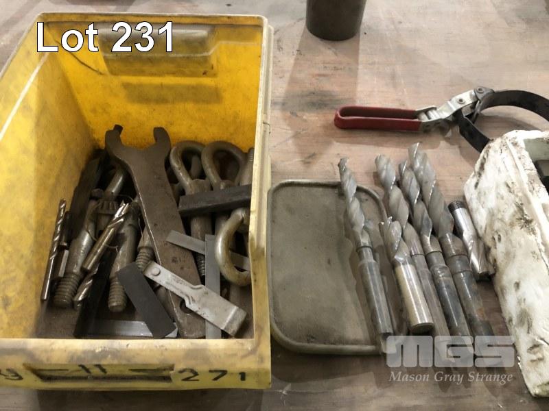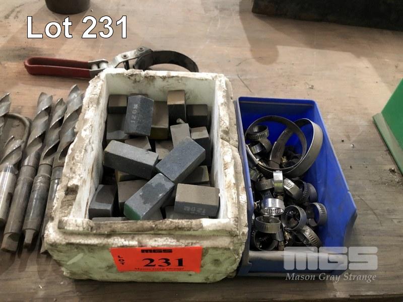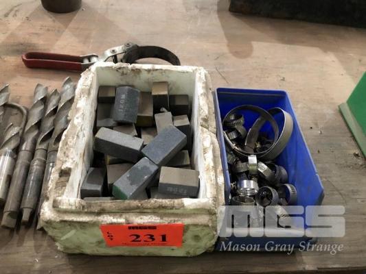 ASSORTED DRILL BITS, END MILLS, 9 x COLLET TOOL HOLDERS & COLLECTS, HONE STONES, HOSE CLAMPS ETC