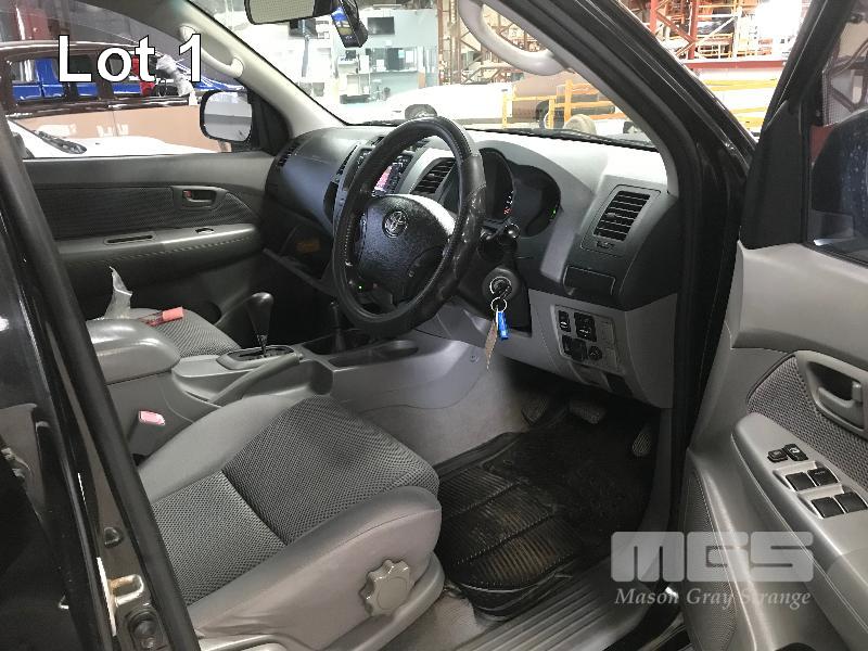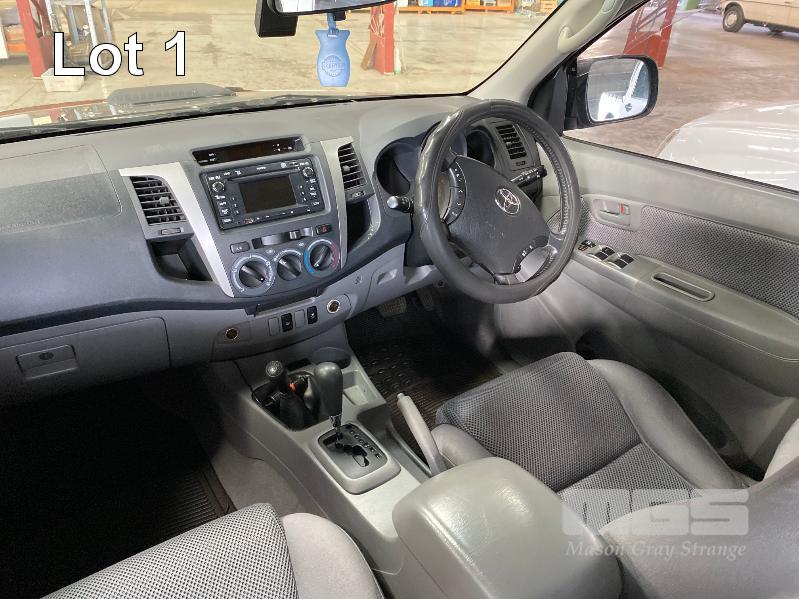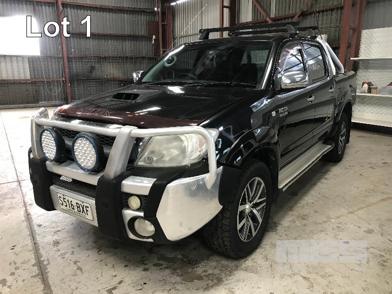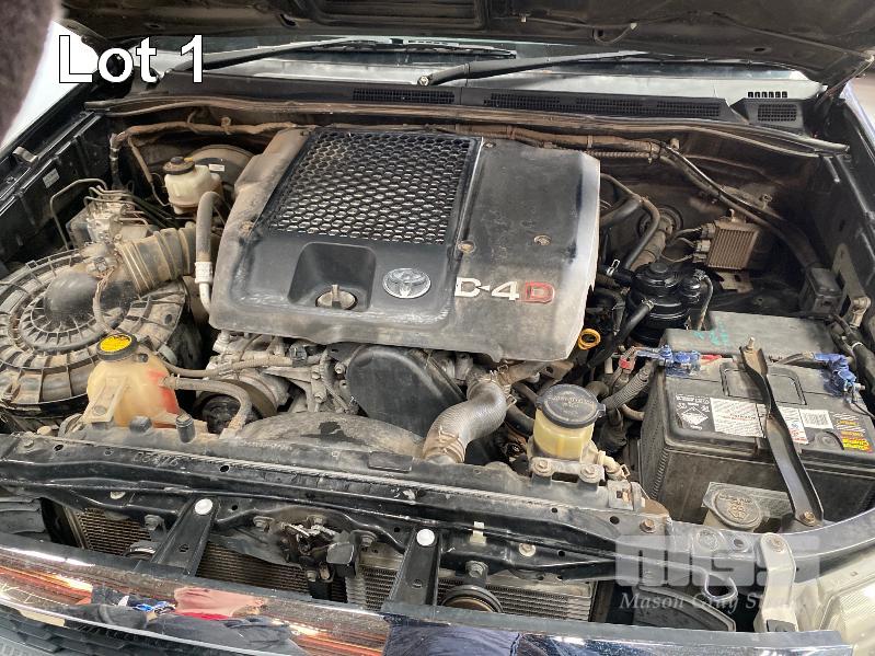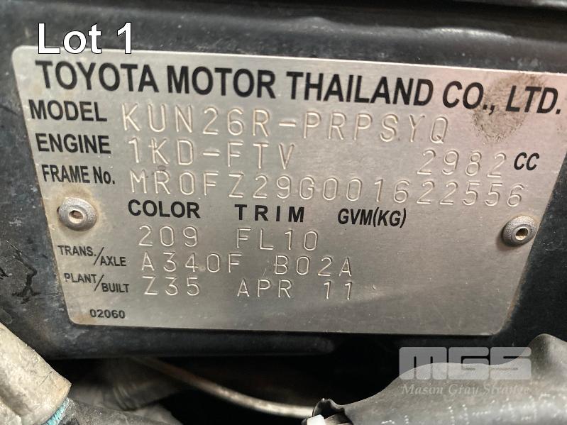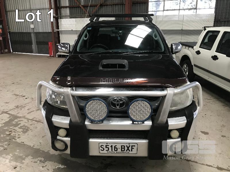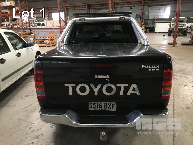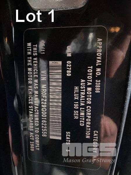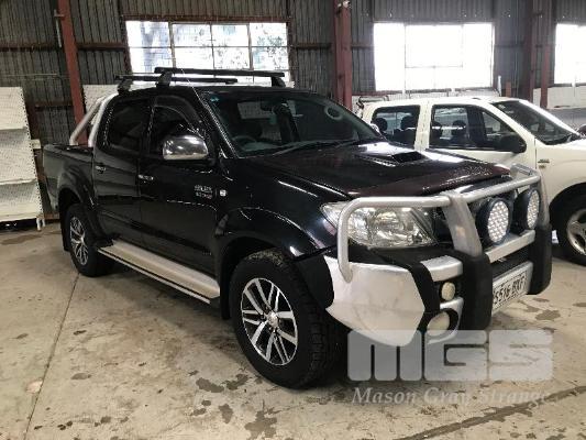2011 TOYOTA HILUX SR5 DUEL CAB UTILITY 4x4 REG: S516 BXF (SA) VIN: MR0FZ29G001622556 ENG: 1KD5342932 ODO: 193,514kms SHOWING 3.0 LITRE TURBO DIESEL, 4 SPEED AUTOMATIC TRANSMISSION, BLACK DUCO, 4 DOORS, 5 SEAT, 4x4 ABS, AIR BAG, AIR CON, ALLOY WHEELS, BLUETOOTH, BULL BAR, CD PLAYER, CENTRAL LOCKING, CRUISE CONTROL, FOG LAMPS, IMMOBILISER, POWER STEERING, POWER WINDOWS, ROOF RACKS, SIDE STEP, SPARE WHEEL, TOW BAR, TRACTION CONTROL, AFTER MARKET REVERSING CAMERA, HARD TONNEAU COVER, BONNET & WINDOW GUARDS (FRONT) KEY #2 (WITH PAPERS, WITH 1 KEY/S, WITH OWNER'S MANUAL, WITH SERVICE BOOKS)