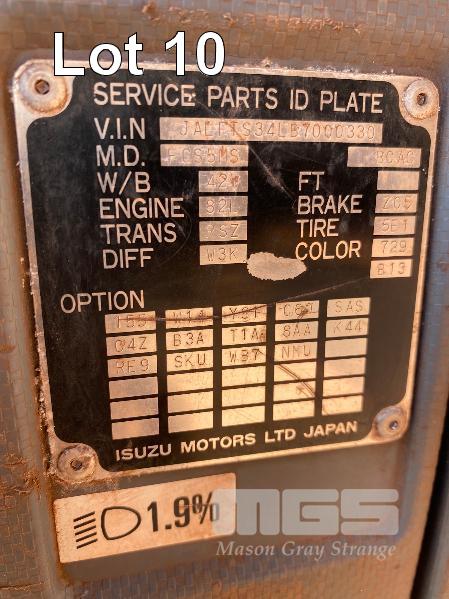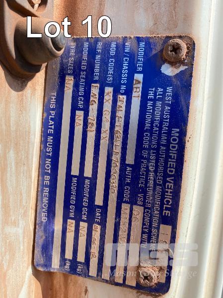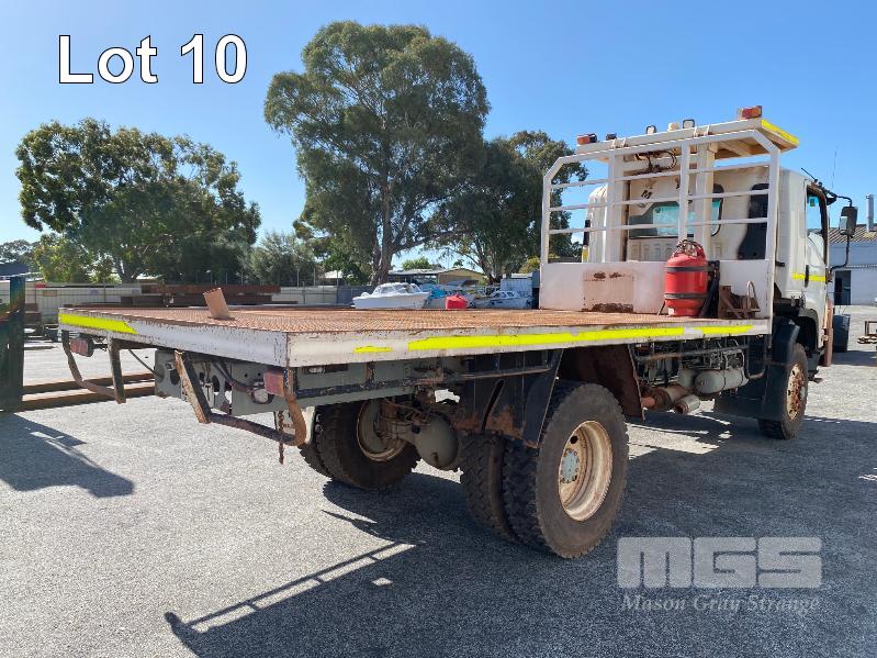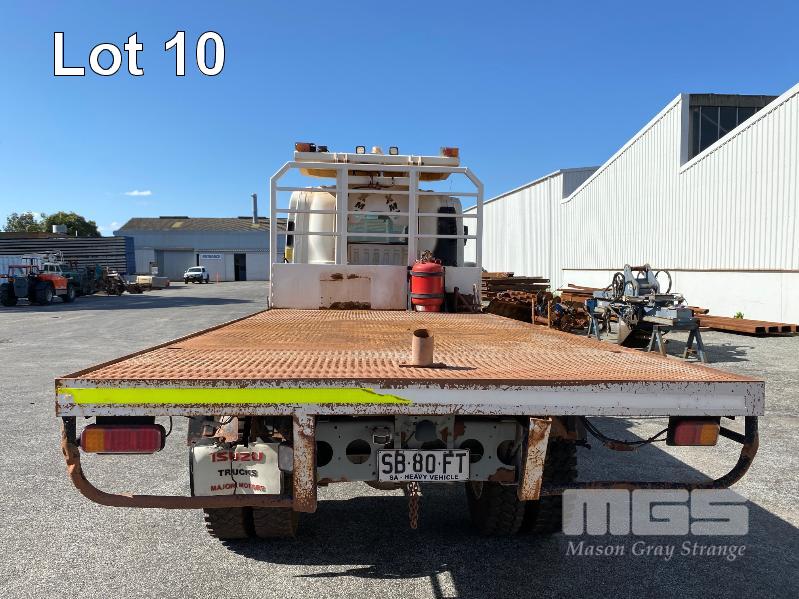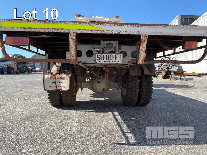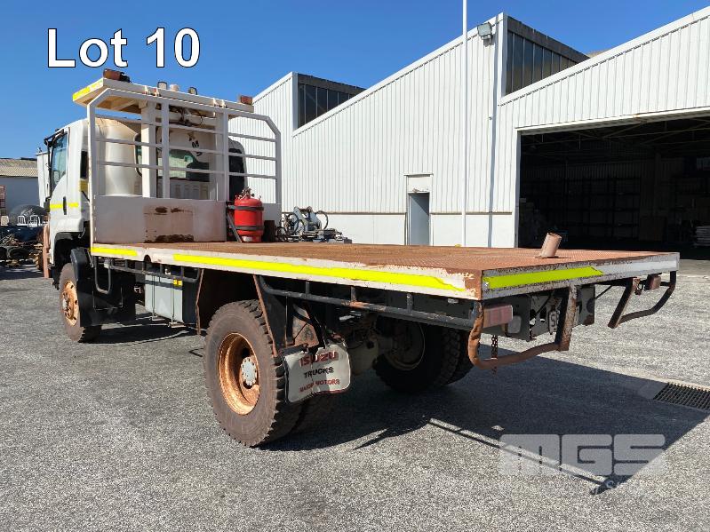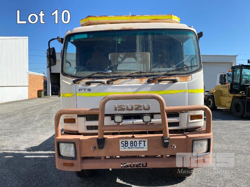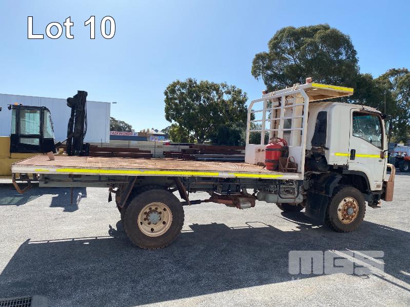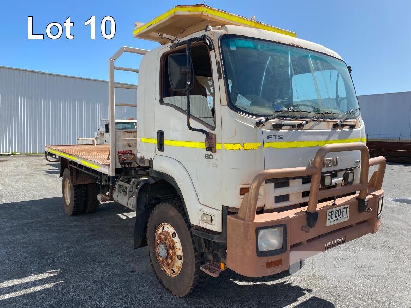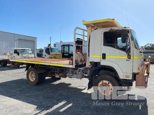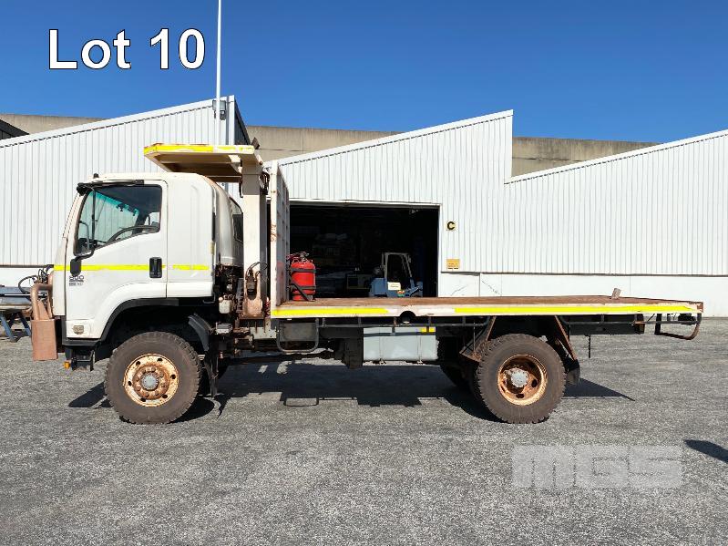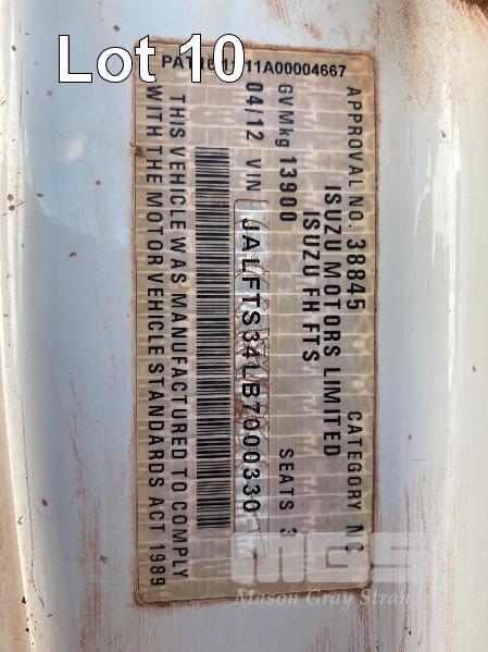 2012 ISUZU FH FTS800 4x4 TRAYTOP TRUCK REG: SB 80 FT (SA) VIN: JALFTS34LB7000330 ODO: 40,466kms SHOWING GVM: 13,900kg SITEC 235 SERIES III, 6 SPEED MANUAL TRANSMISSION, TURBO DIESEL, SPRING SUSPENSION, WHITE DUCO, 11R22.5 2 DOORS, 3 SEAT, AIR CON, BULL BAR, CHECKER PLATE STEEL TRAY ROPS PROTECTION FIRE SUPPRESSION SYSTEM ISOLATION SWITCHES HAZARD & SPOT LIGHTS TRAY SIZE: 5000 x 2500mm KEY #11 (WITH 1 KEY/S)
