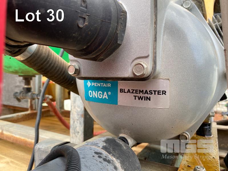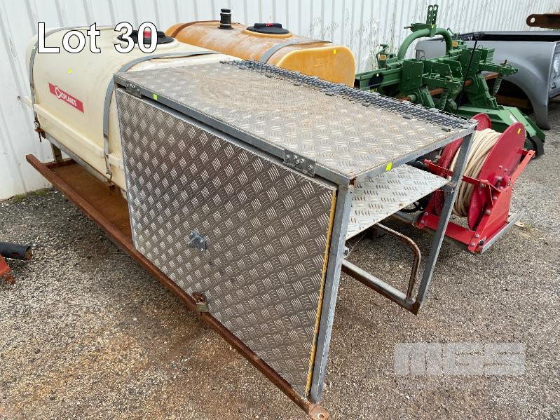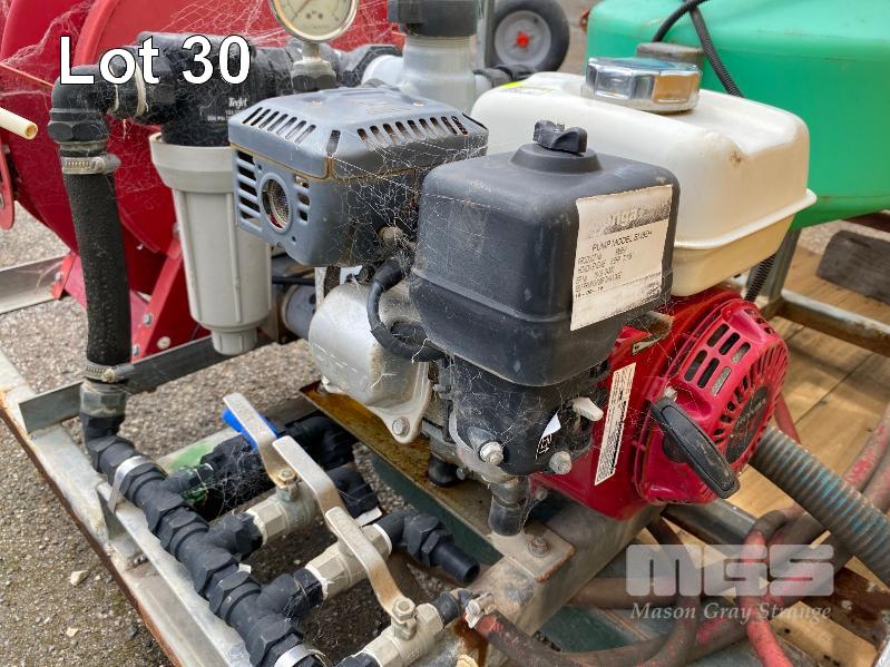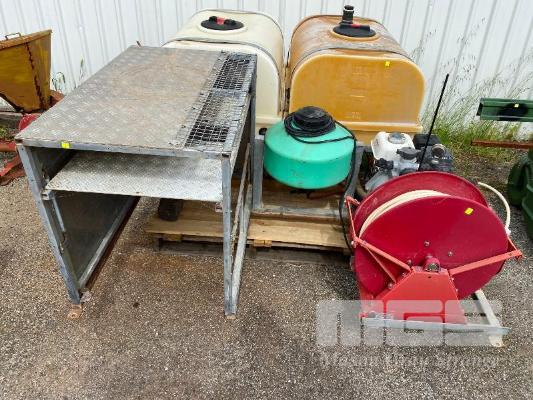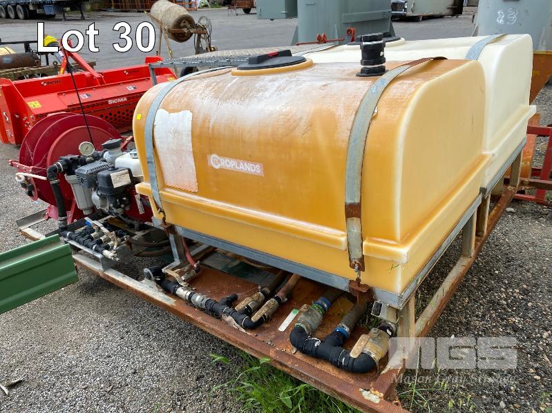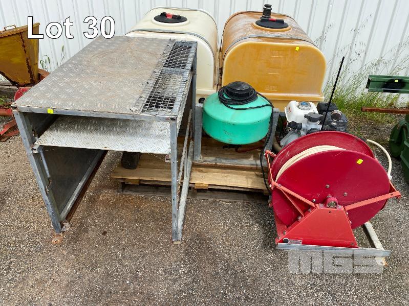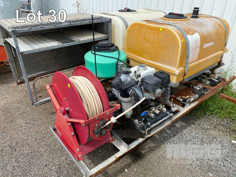 SPRAY UNIT, CROPLANDS SKID BASE, SUIT UTE/TRAILER COMPRISING 2 x 400 LITRE POLY TANKS, PLUMBED TO ONGA BLAZEMASTER PUMP, MOD: BM65N POWERED BY HONDA GX200 PETROL ENGINE 6.5HP WITH QUICK CORP HOSE REEL, 50 LITRE CHEMICAL DOSING TANK & LOCKABLE STORAGE UNIT TOTAL SKID BASE: 2450 x 1800mm