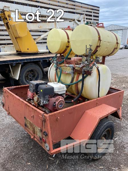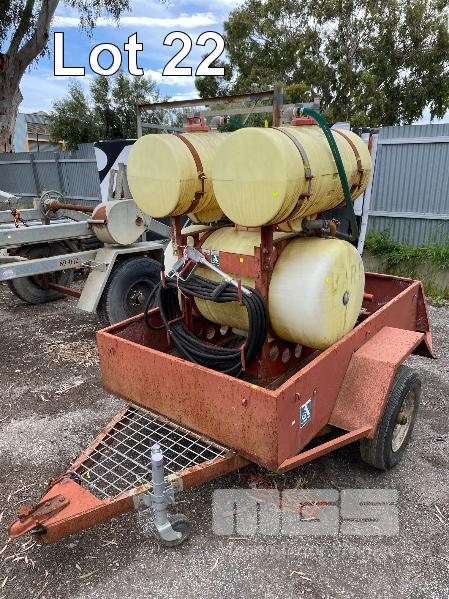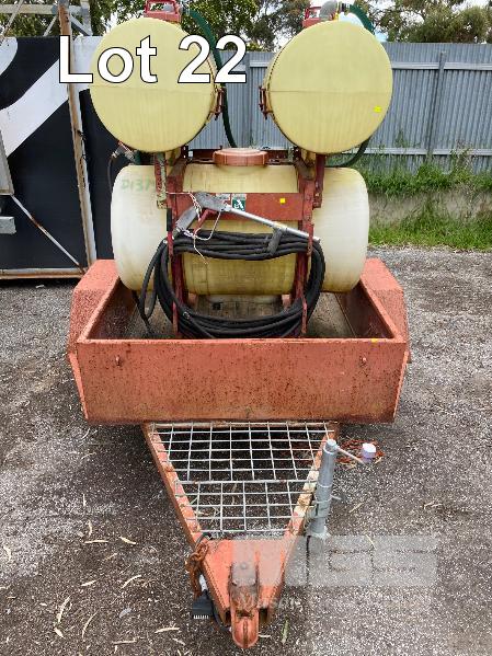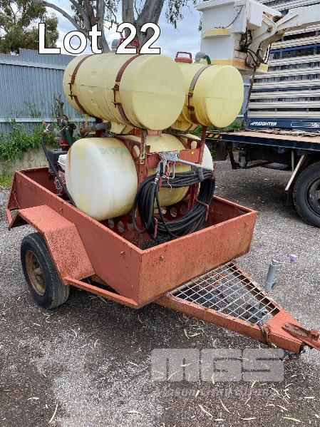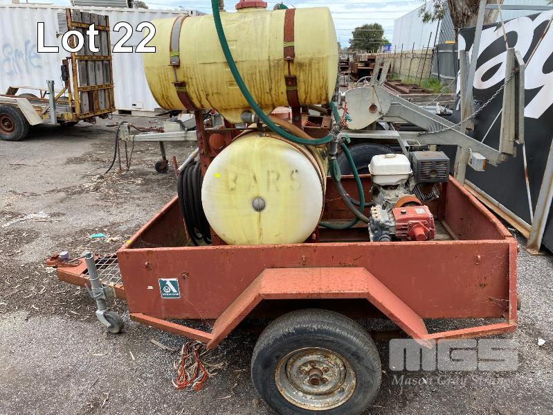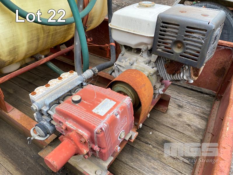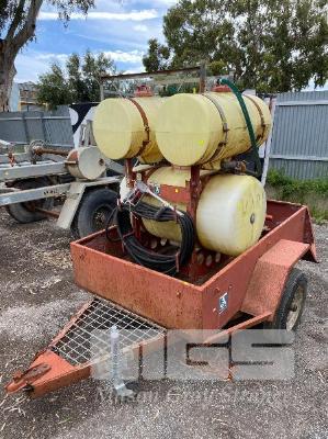 TRAILER MOUNT SPRAY UNIT, SINGLE AXLE, 6x4ft (1800 x 1200mm) BALL HITCH, JOCKEY WHEEL, AGRICULTURAL SPRAY UNIT COMPRISING 3 x POLY TANKS, 2 x 100 LITRE & 1 x 200 LITRE DRIVEN BY HONDA GX240 PETROL ENGINE, 8HP, WITH ILEMO PRESSURE PUMP, MOD: B-III-L HOSE & SPRAY GUN NO REGO OR COMPLIANCE PLATES