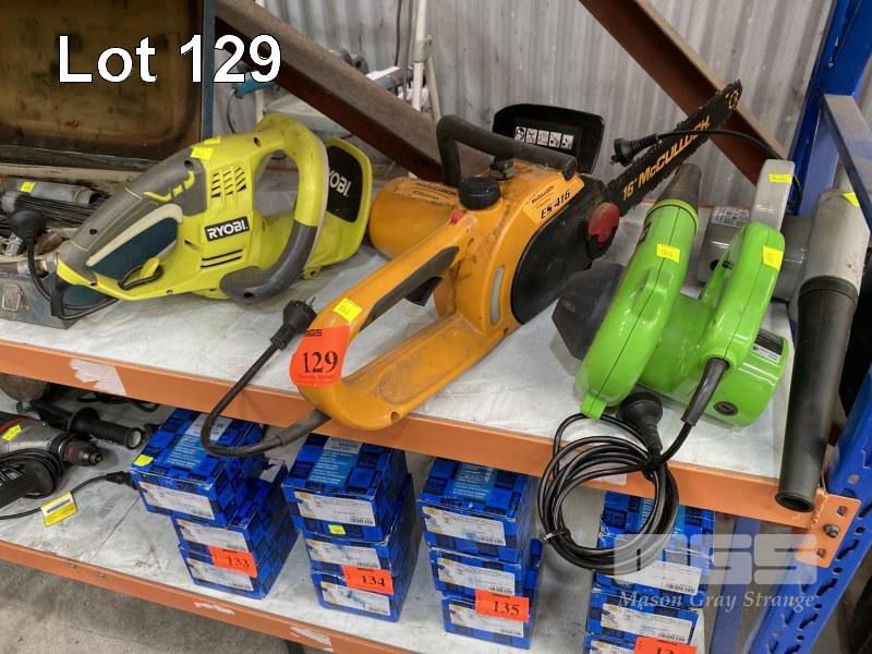RYOBI HEDGE TRIMMER, MCCULLOCH CHAINSAW, ES416 & 2 x BLOWER UNITS, 240V